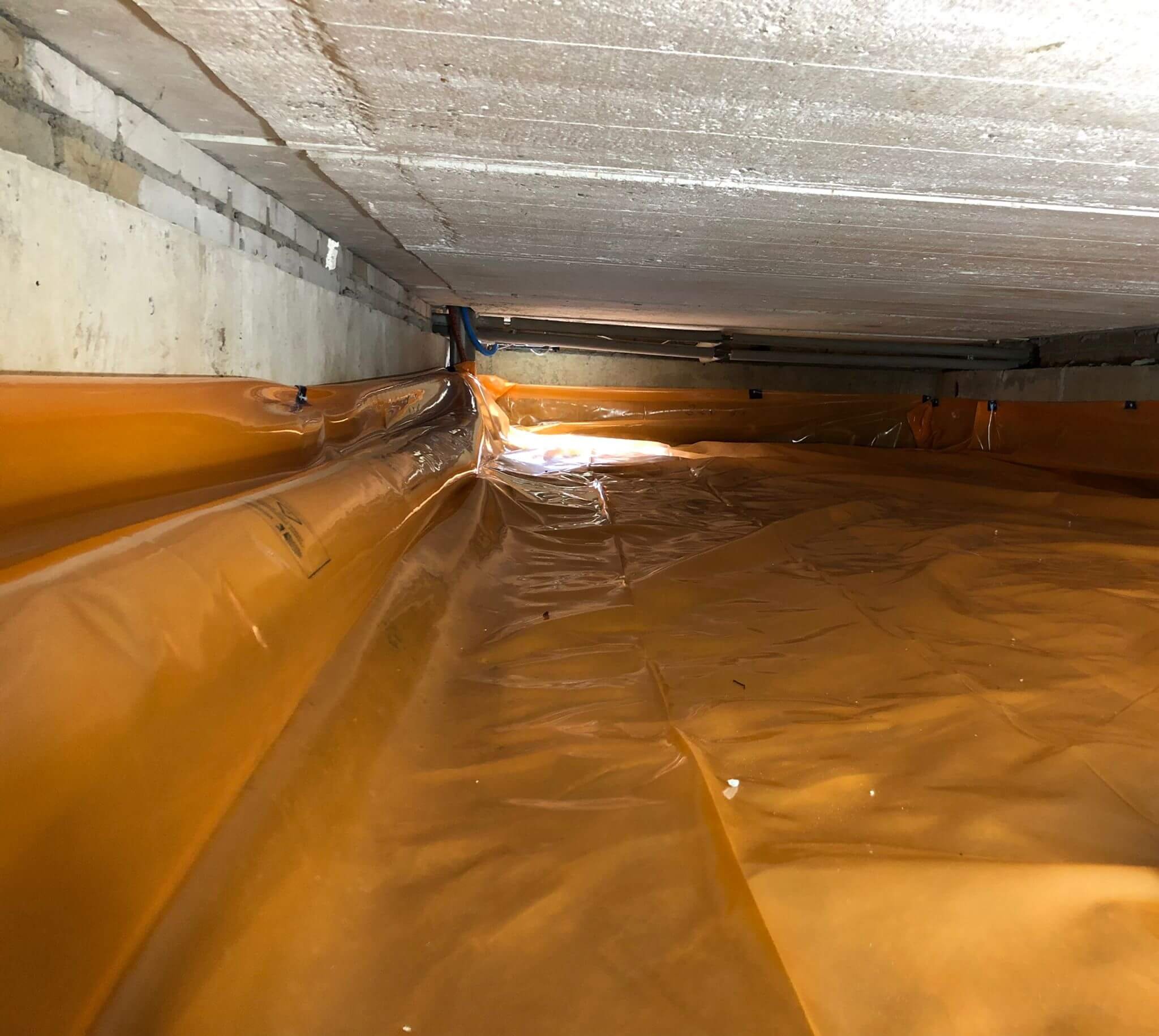 De folie wordt zo geplaatst dat de kruipruimte toegankelijk blijft voor onderhoud.